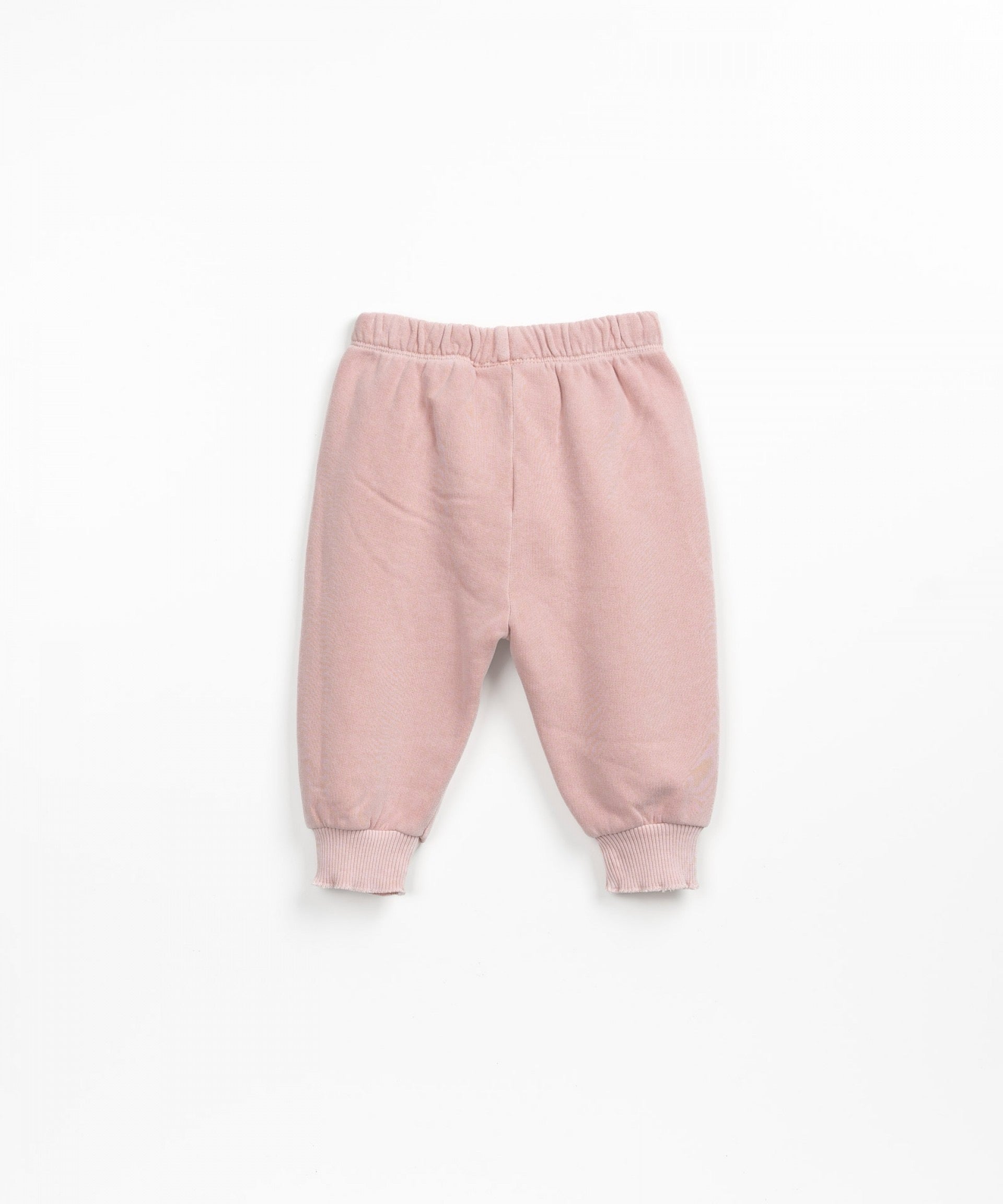 These jersey pants are made from a mixture of organic cotton and cotton, Memories color. The model has elastic waist and cuffs and a decorative drawstring.