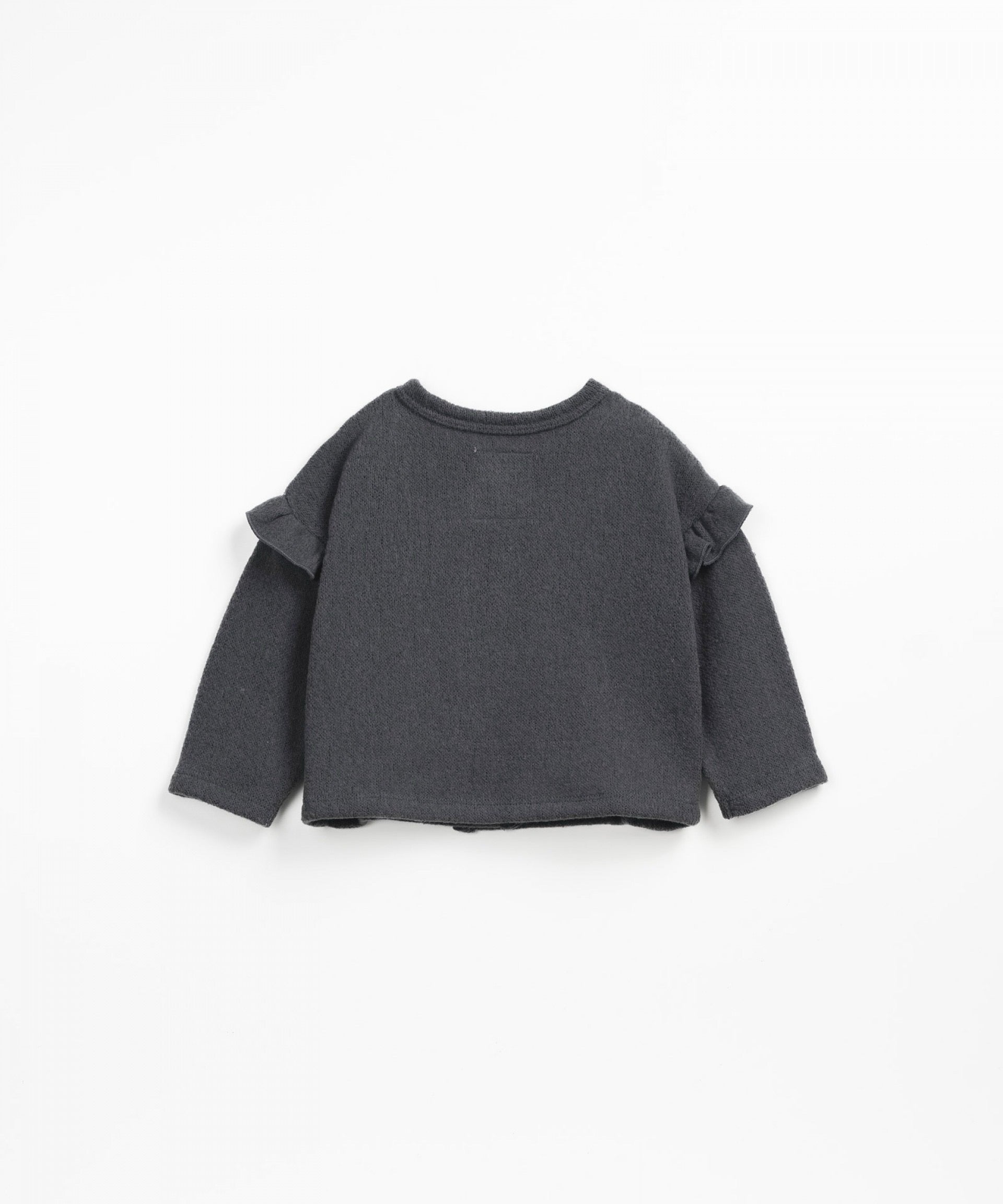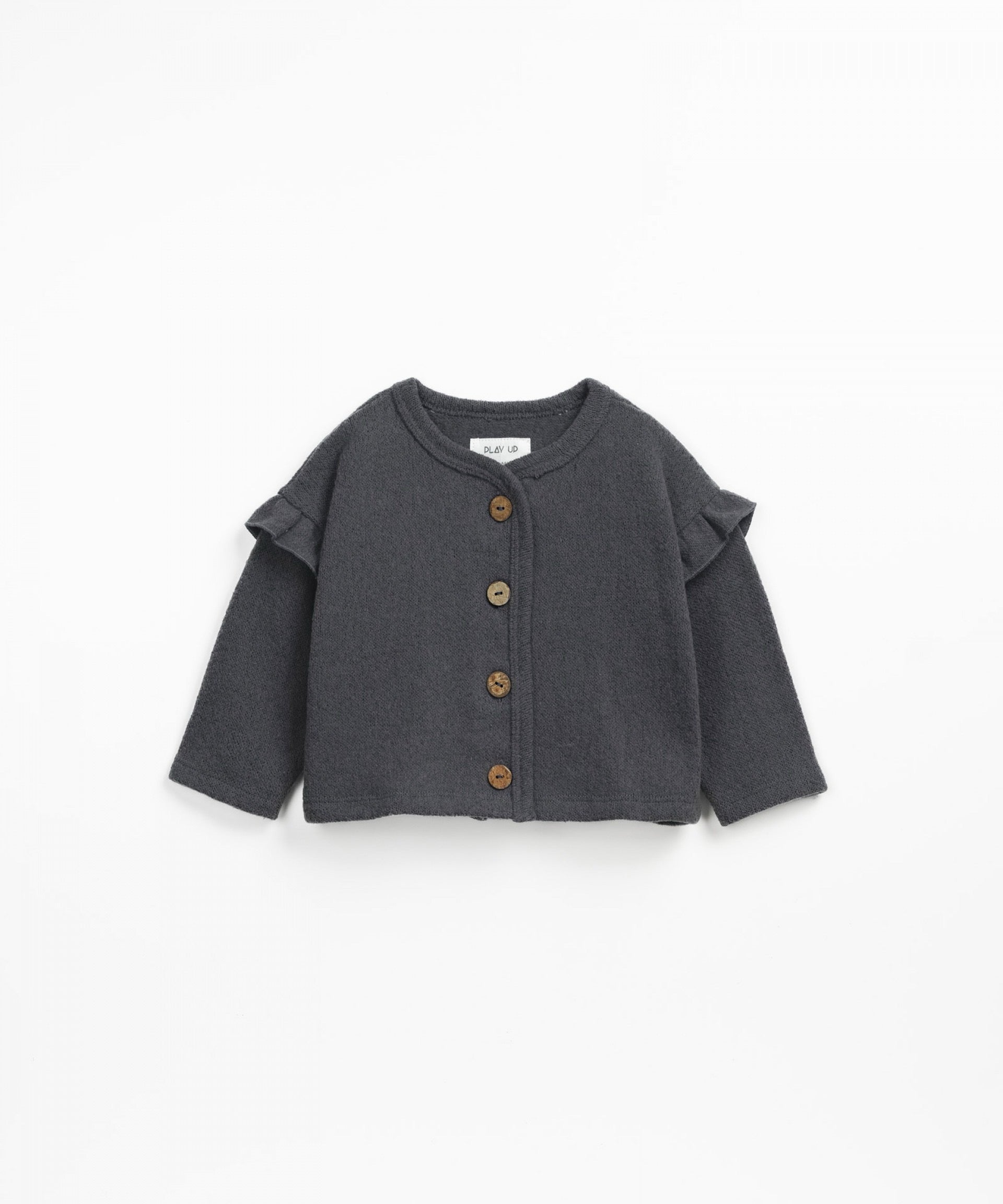 This jersey cardigan is made from a mixture of recycled fibers, Shadow color, and contains 33% of our Re(Play) recycled yarn. The model has carding on the inside, a round neckline, ruffle detail on the sleeves and a front opening with coconut buttons.