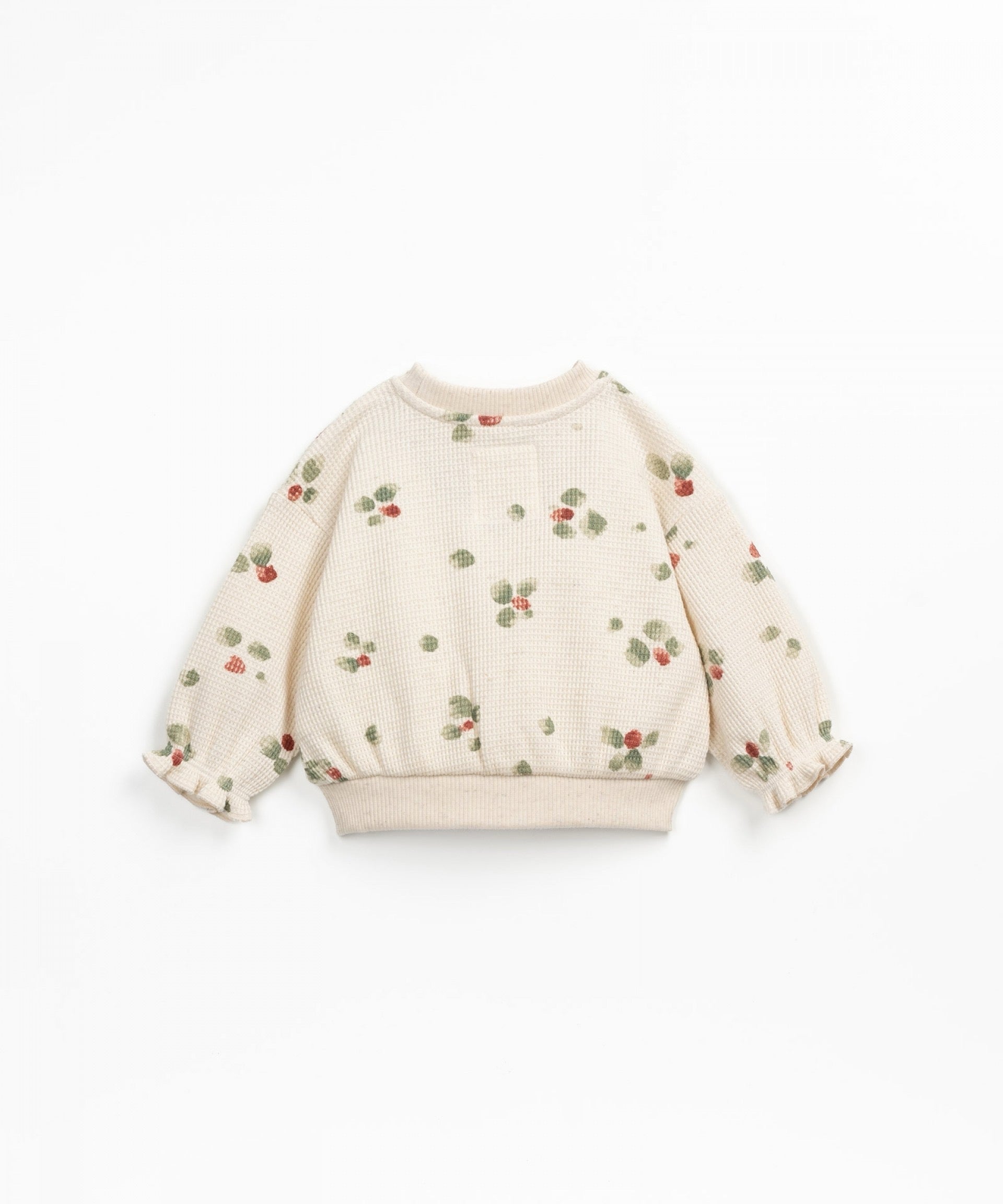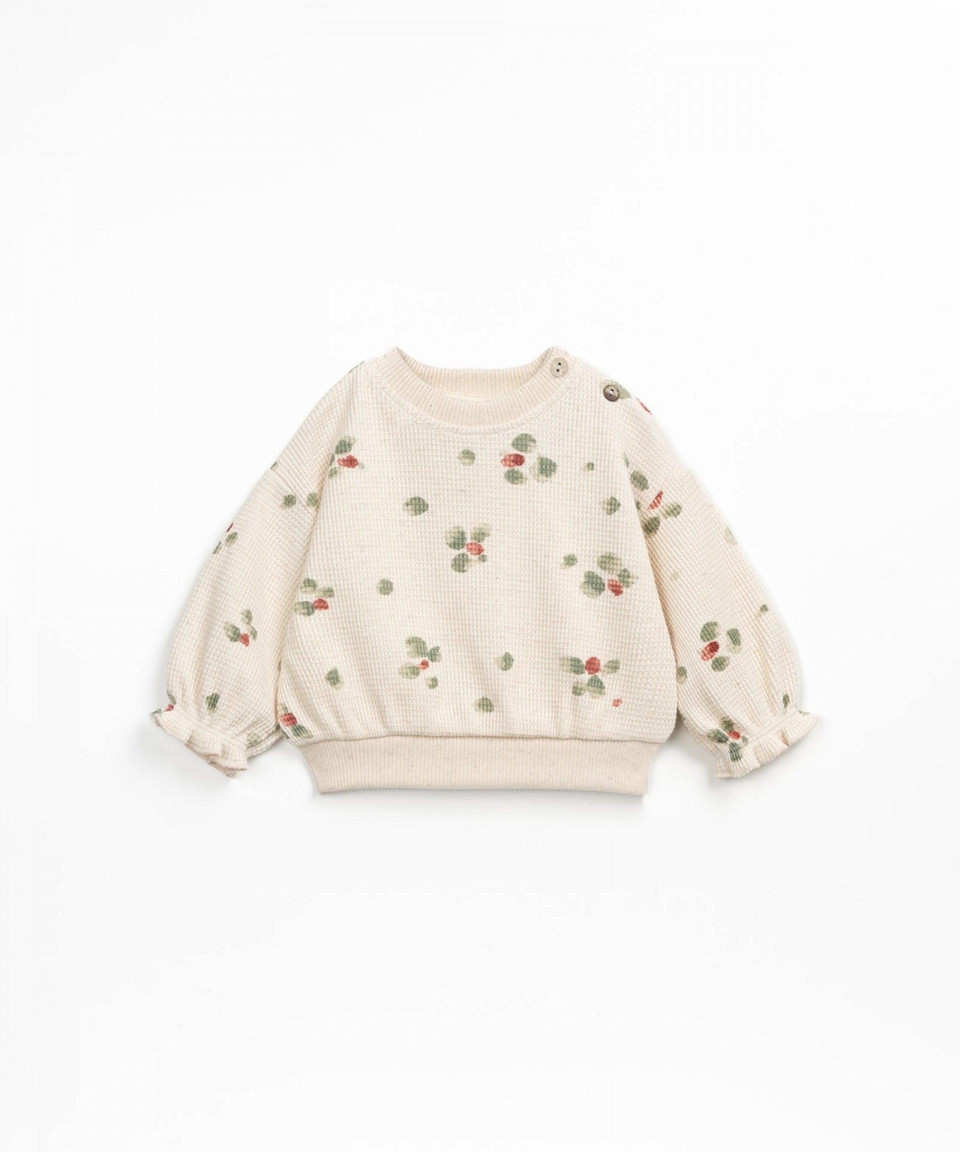 This interlock sweater is made from a mixture of organic cotton and hemp, Sheep color. The model has a round neckline, elastic cuffs and hem and our flower spot print.
