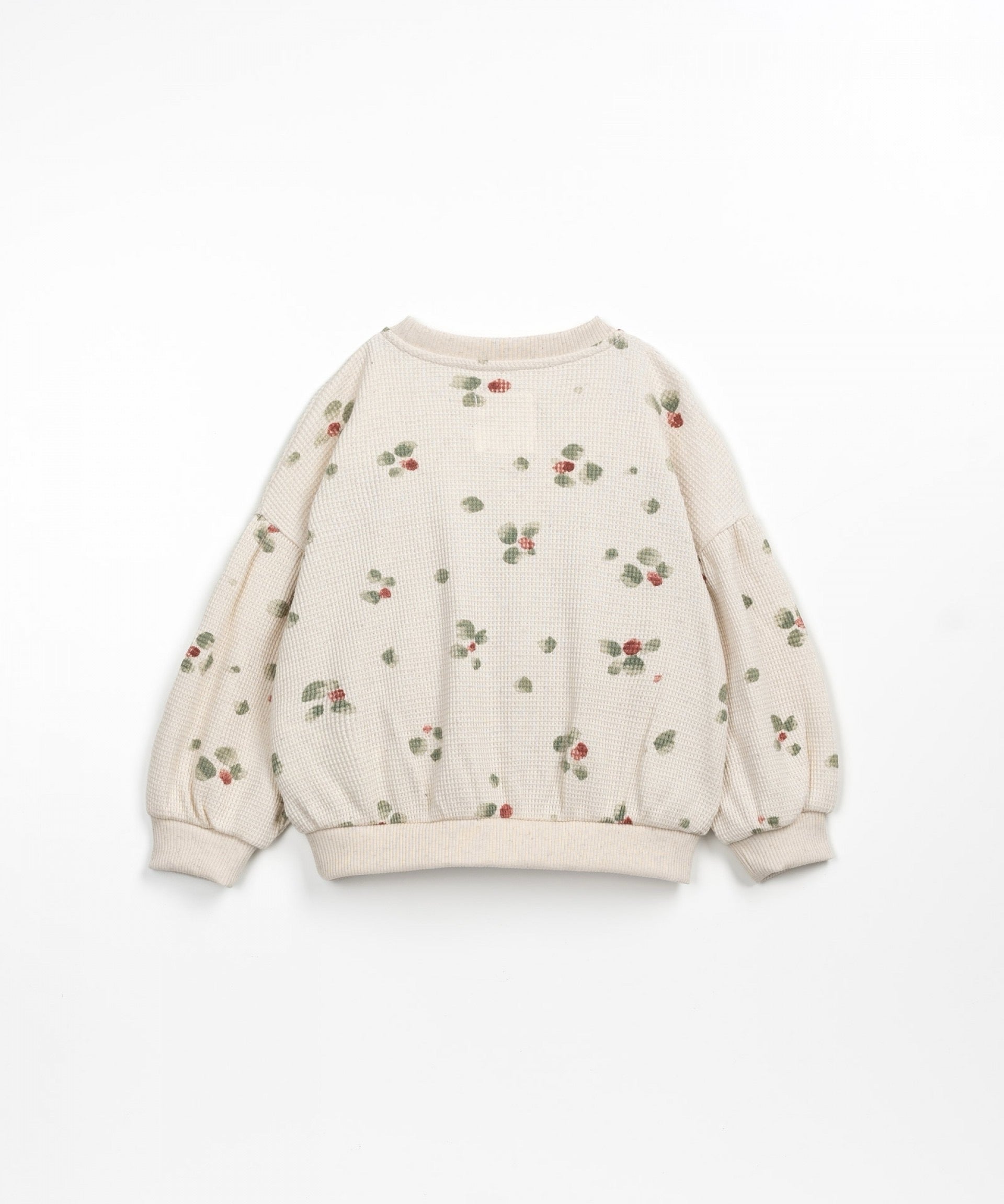 This interlock sweater is made from a mixture of organic cotton and hemp, Sheep color. The model has a round neckline, elastic cuffs and hem and our flower spot print.