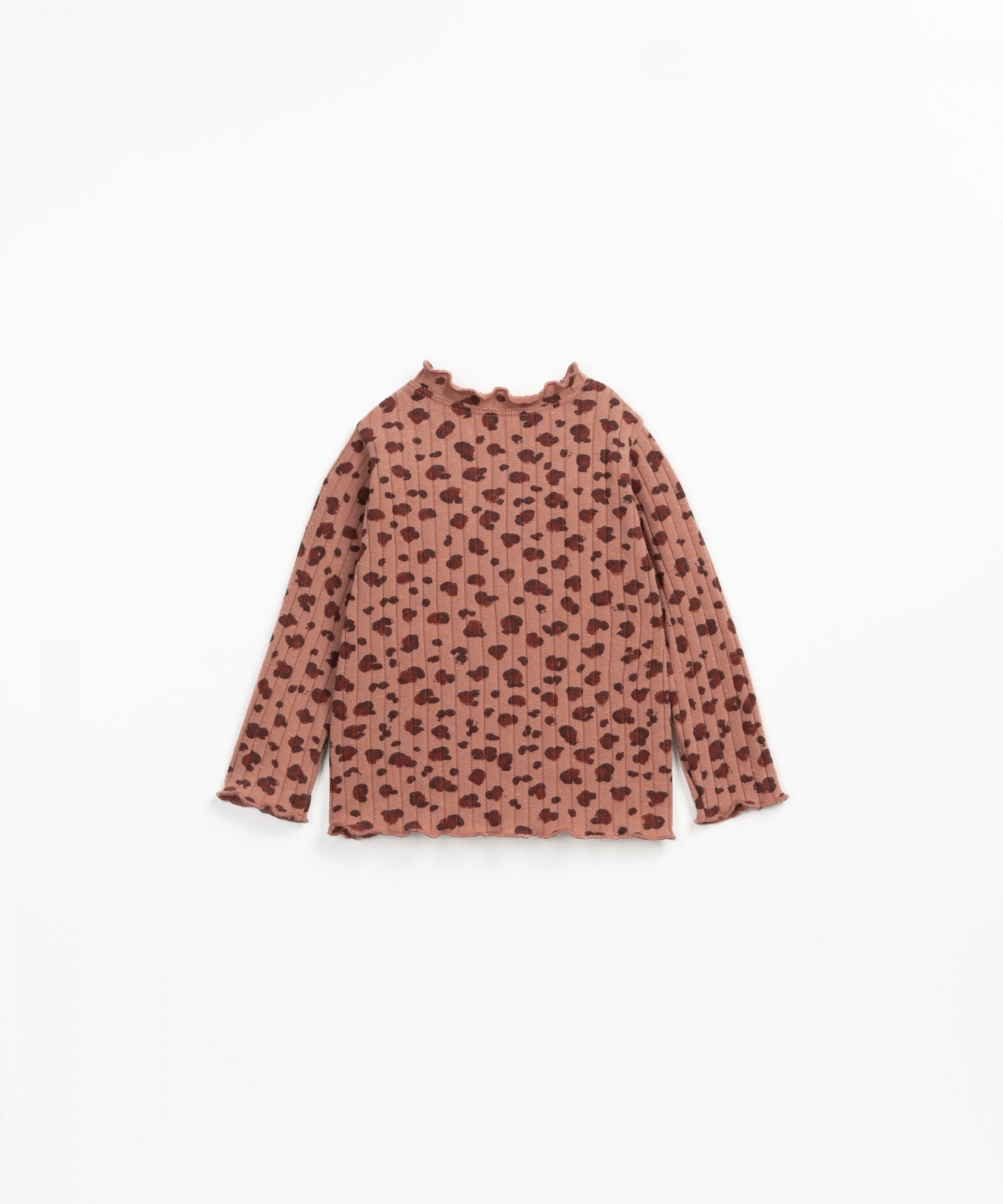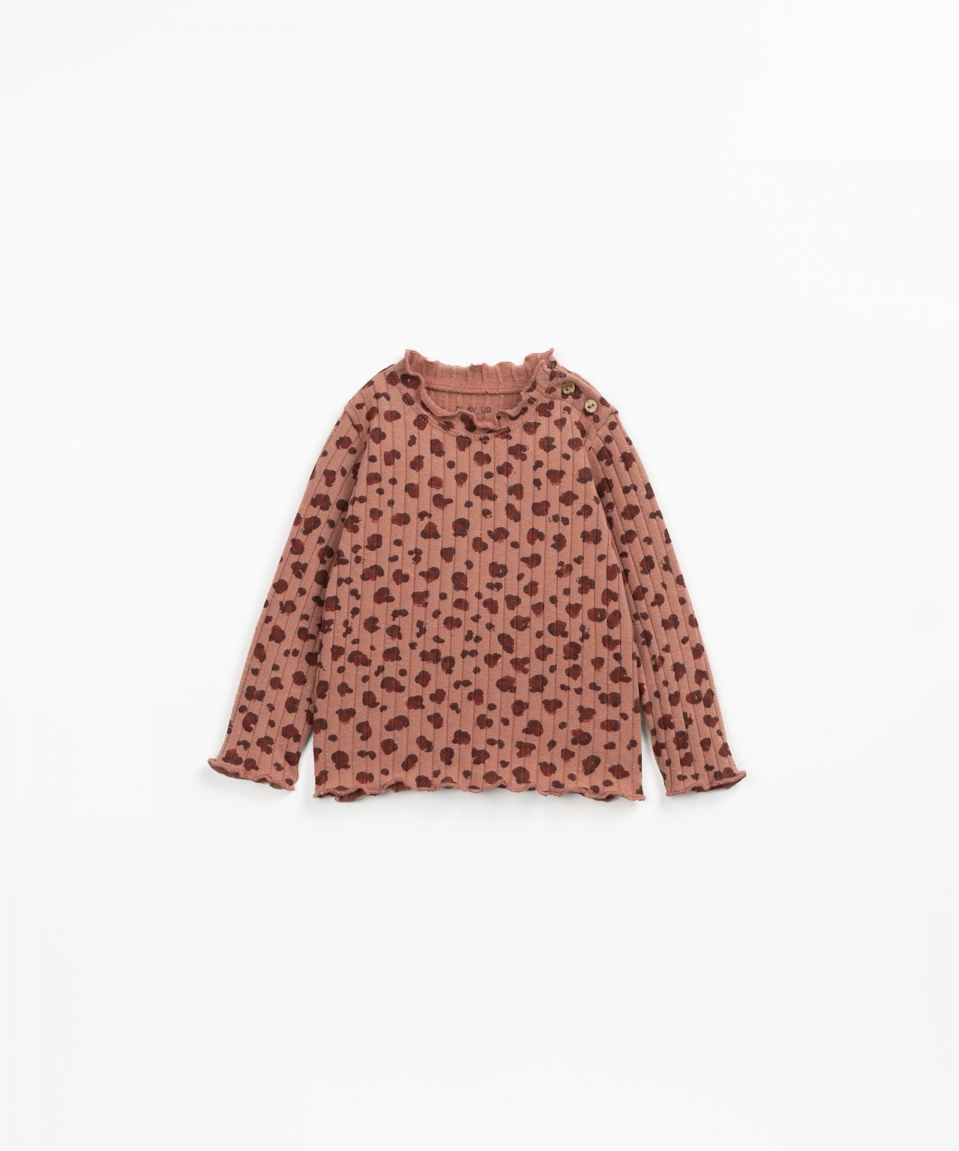 This ribbed t-shirt is made from a mixture of recycled cotton, recycled polyester, cotton and polyester, Maria color. The model has a simple collar, long sleeves, an opening on the shoulder with coconut buttons and our flower spot print.