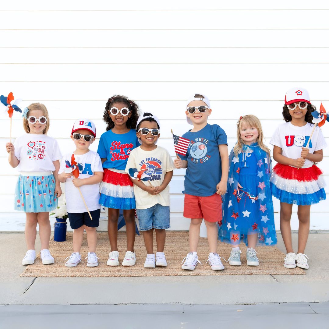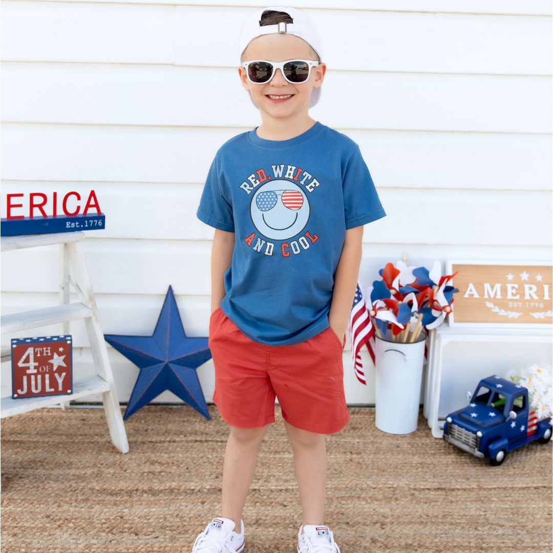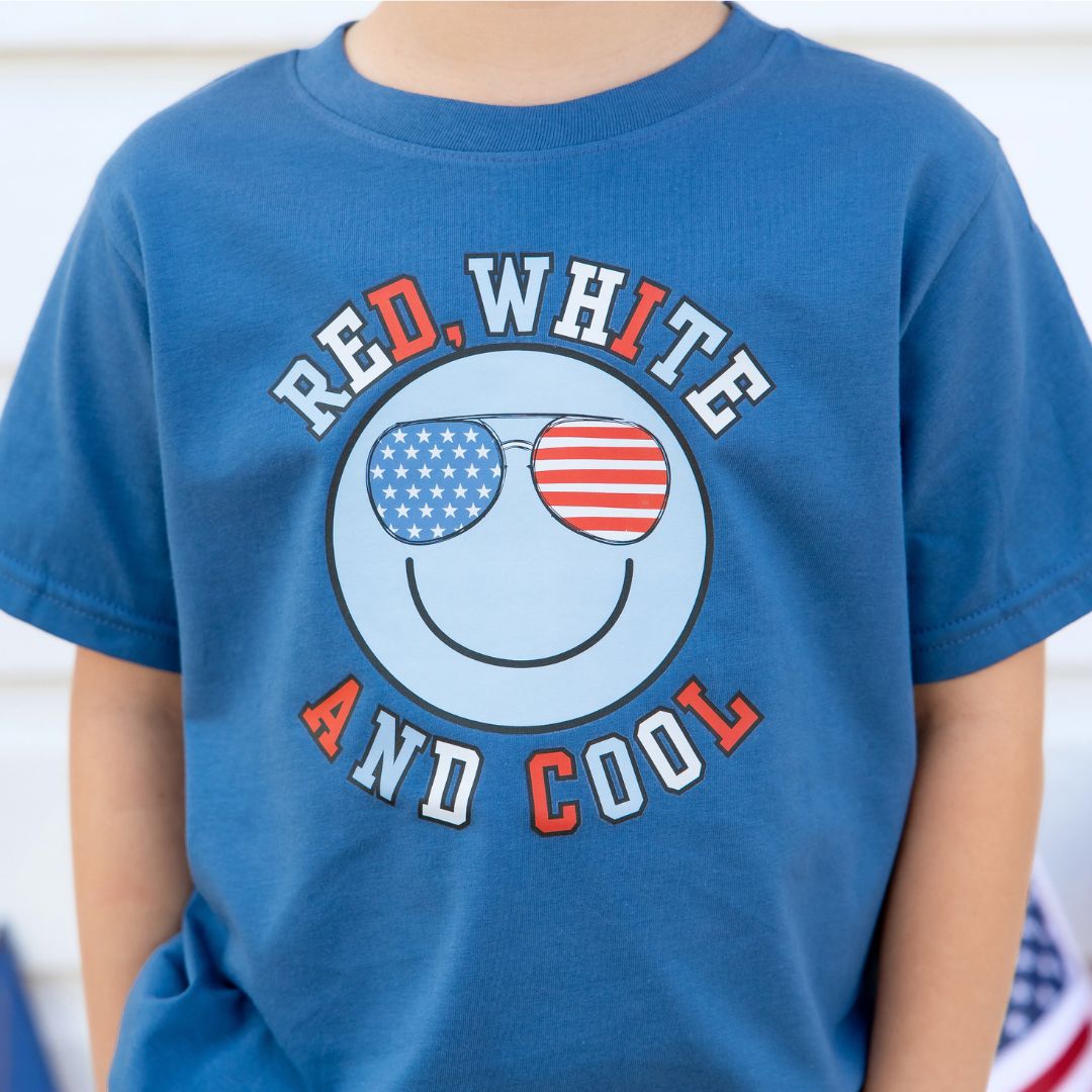 The Red, White, and Cool Patriotic Smiley Short Sleeve T-Shirt is a fun and festive t-shirt for kids celebrating the 4th of July or to show patriotic spirit any day!