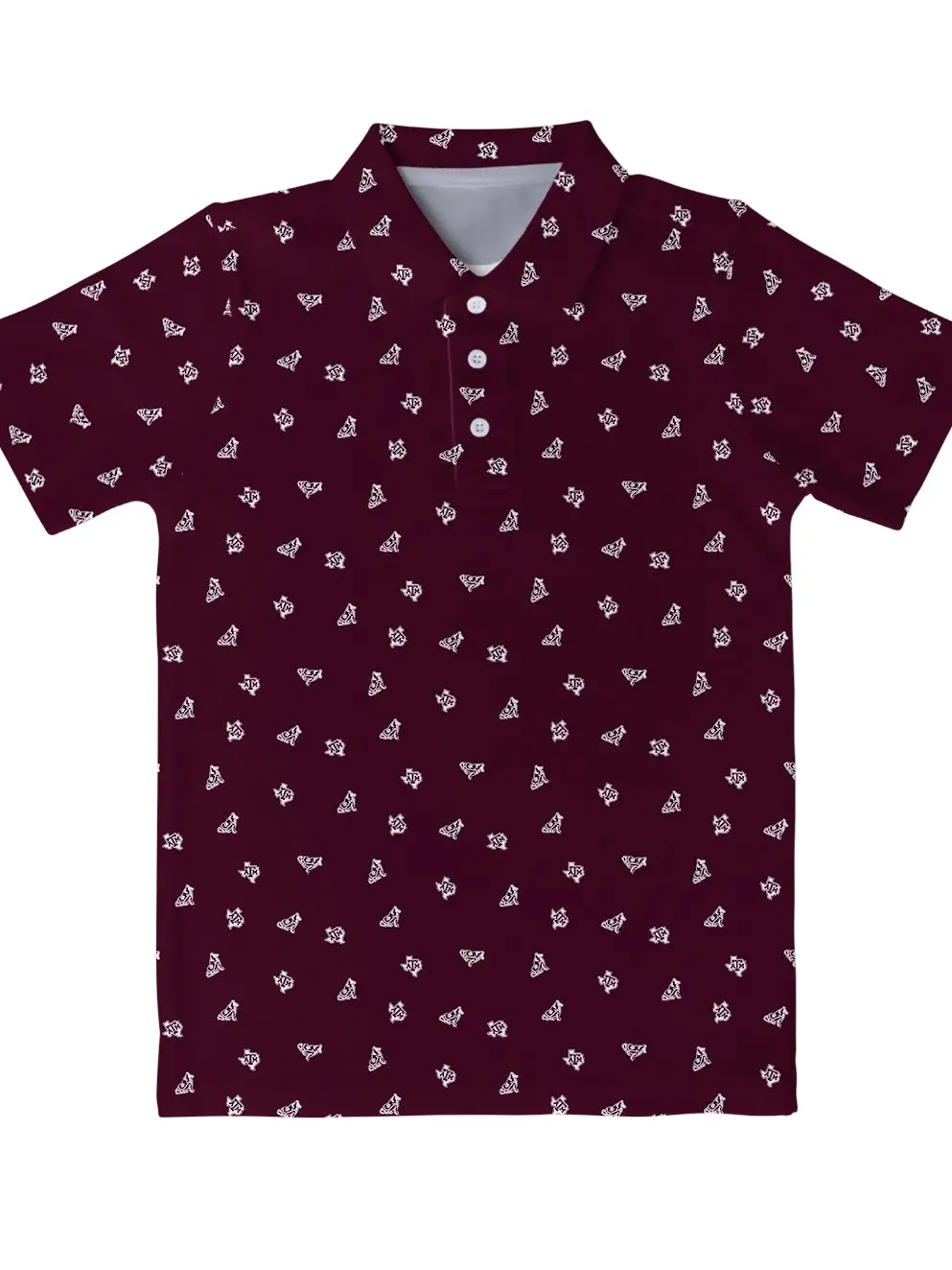 Celebrate and cheer on game day with our classic design TAMU Aggies Repeat Logo Polo with embroidered logo on the chest, moisture wicking USA-made fabric, 3-button placket, and button on the back of the collar.