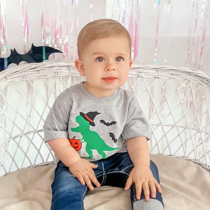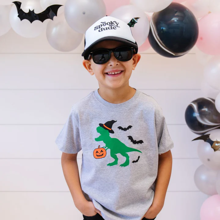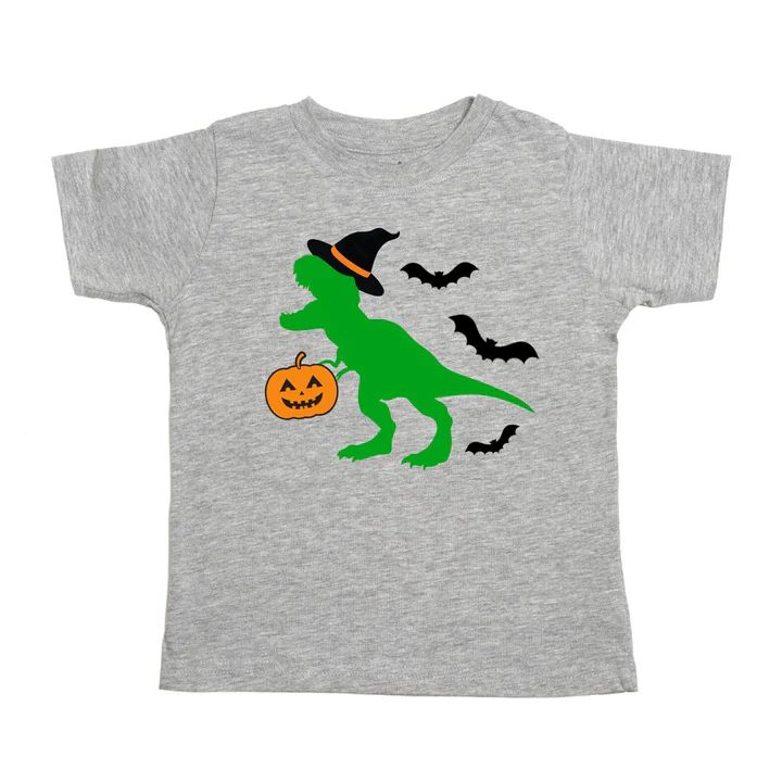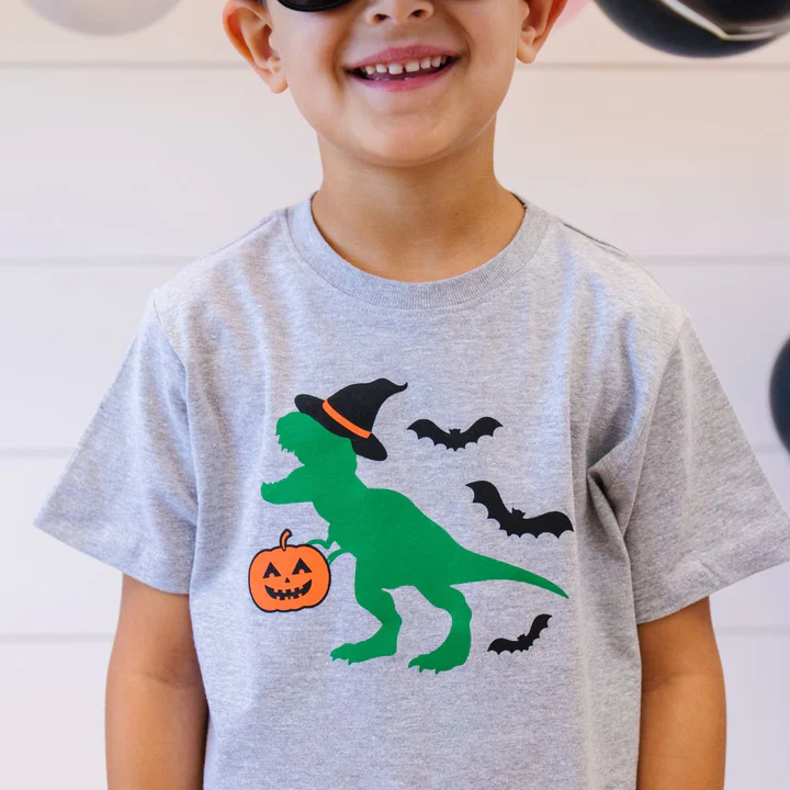 The Trick Rawr Treat Halloween Short Sleeve T-Shirt is a fun and festive t-shirt for kids celebrating Halloween!