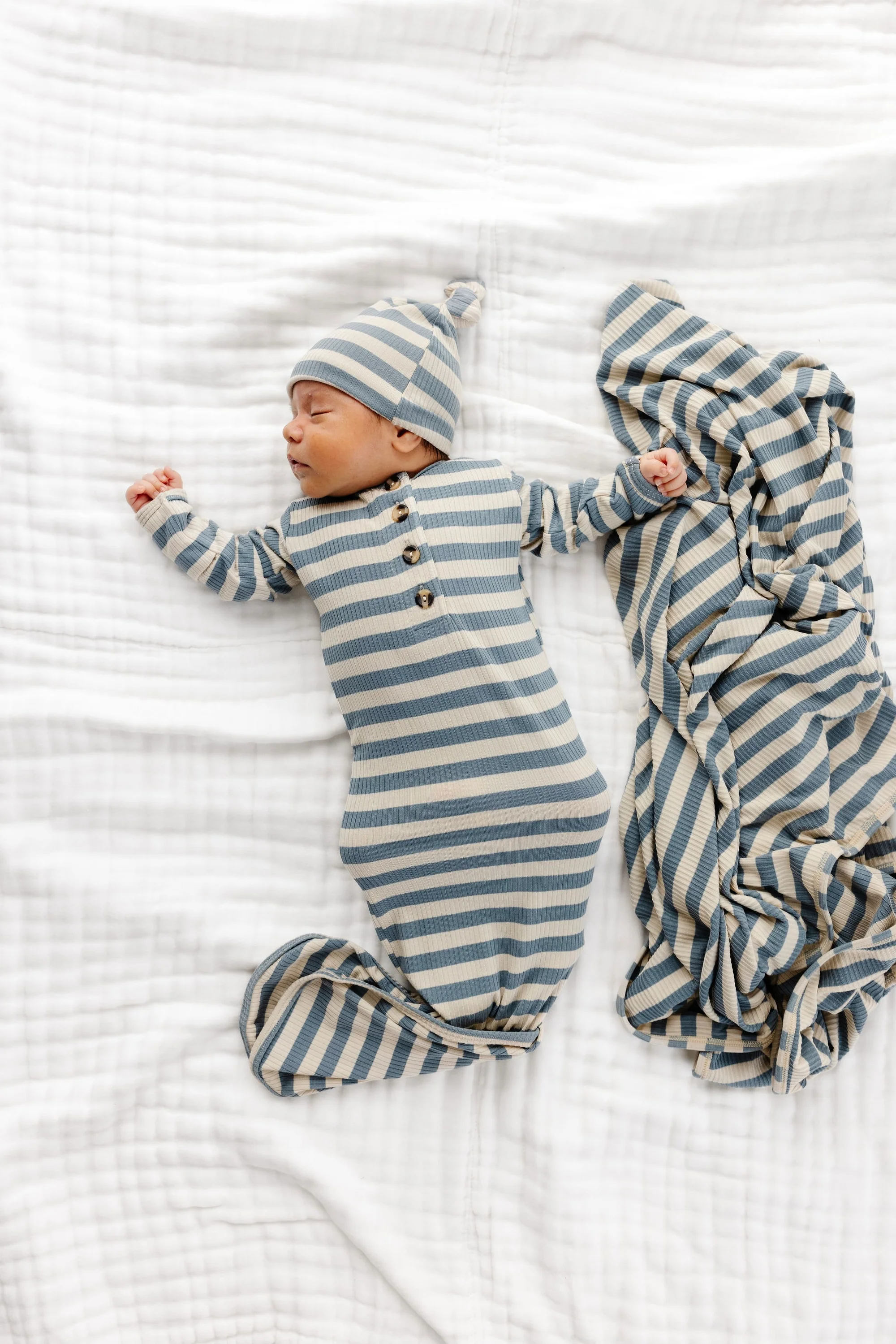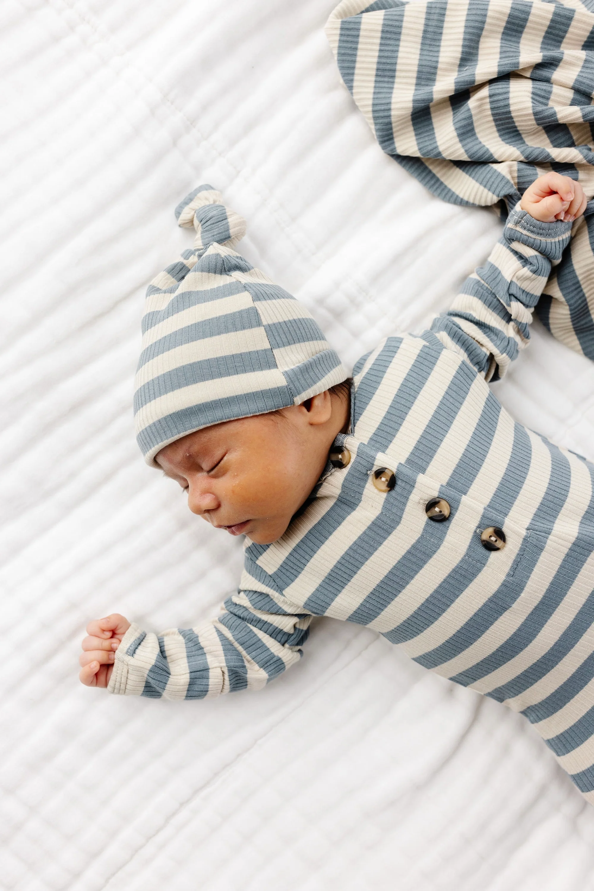The easiest tie-bottom outfit for day or night. Made for hassle free diaper changes and gentle dressing, I designed this with a button-down front and tie bottom for simple closure (no more snaps at 2am!). Fold over wrist cuffs are the most thoughtful finishing touch.