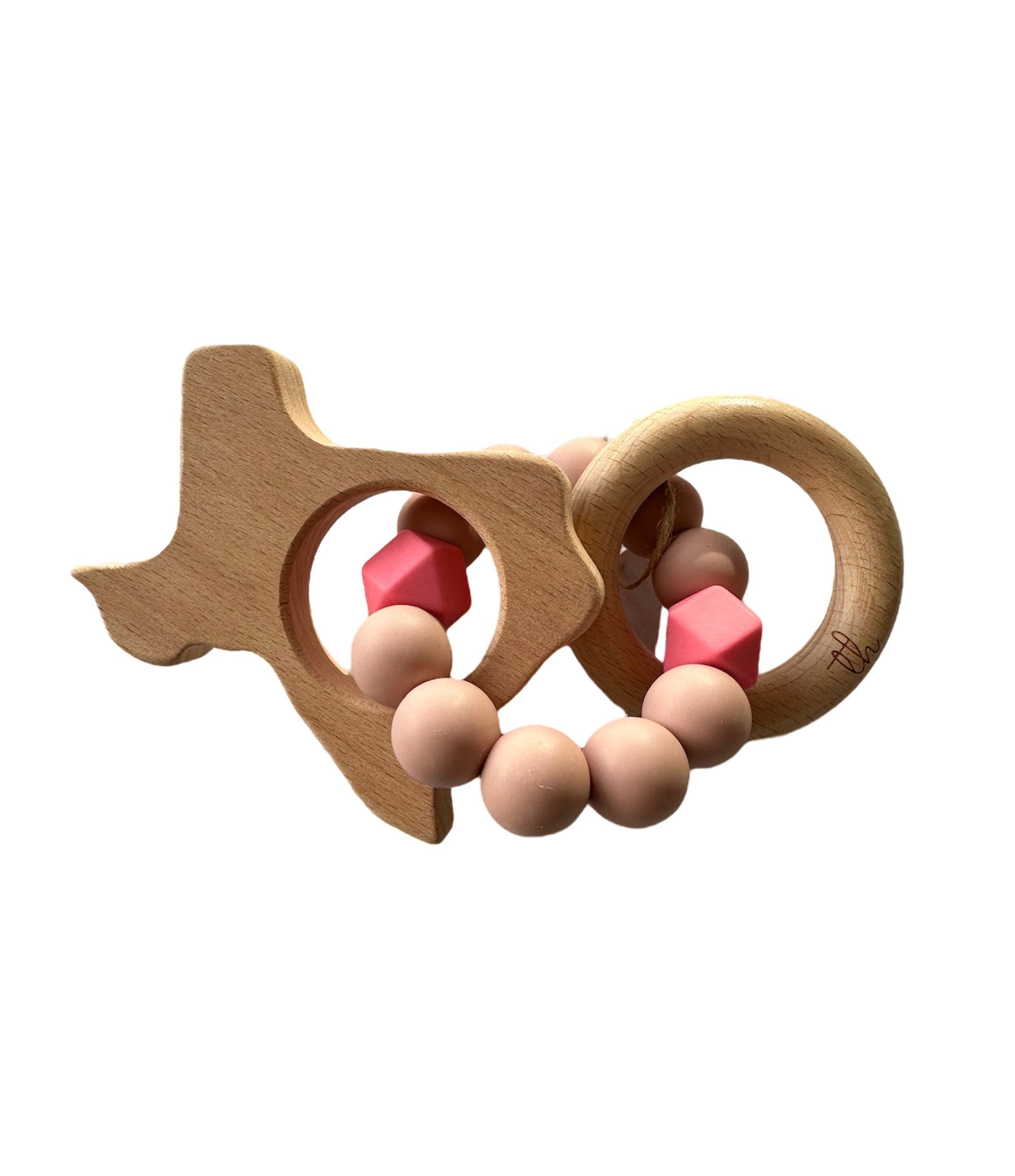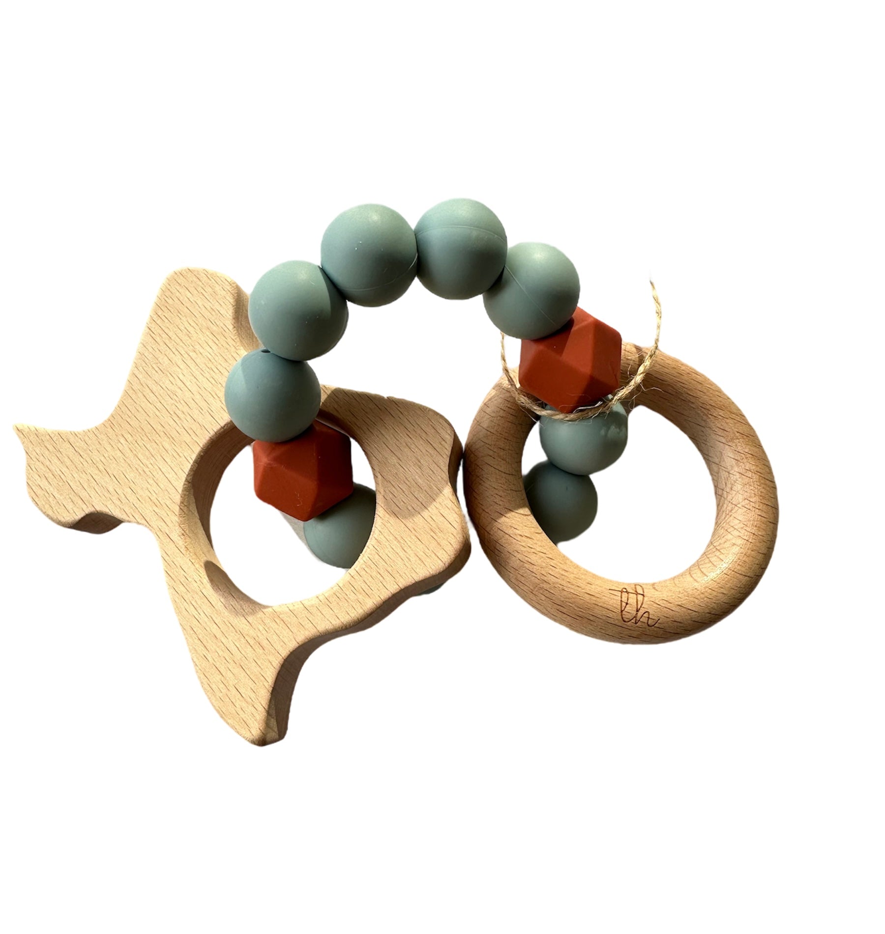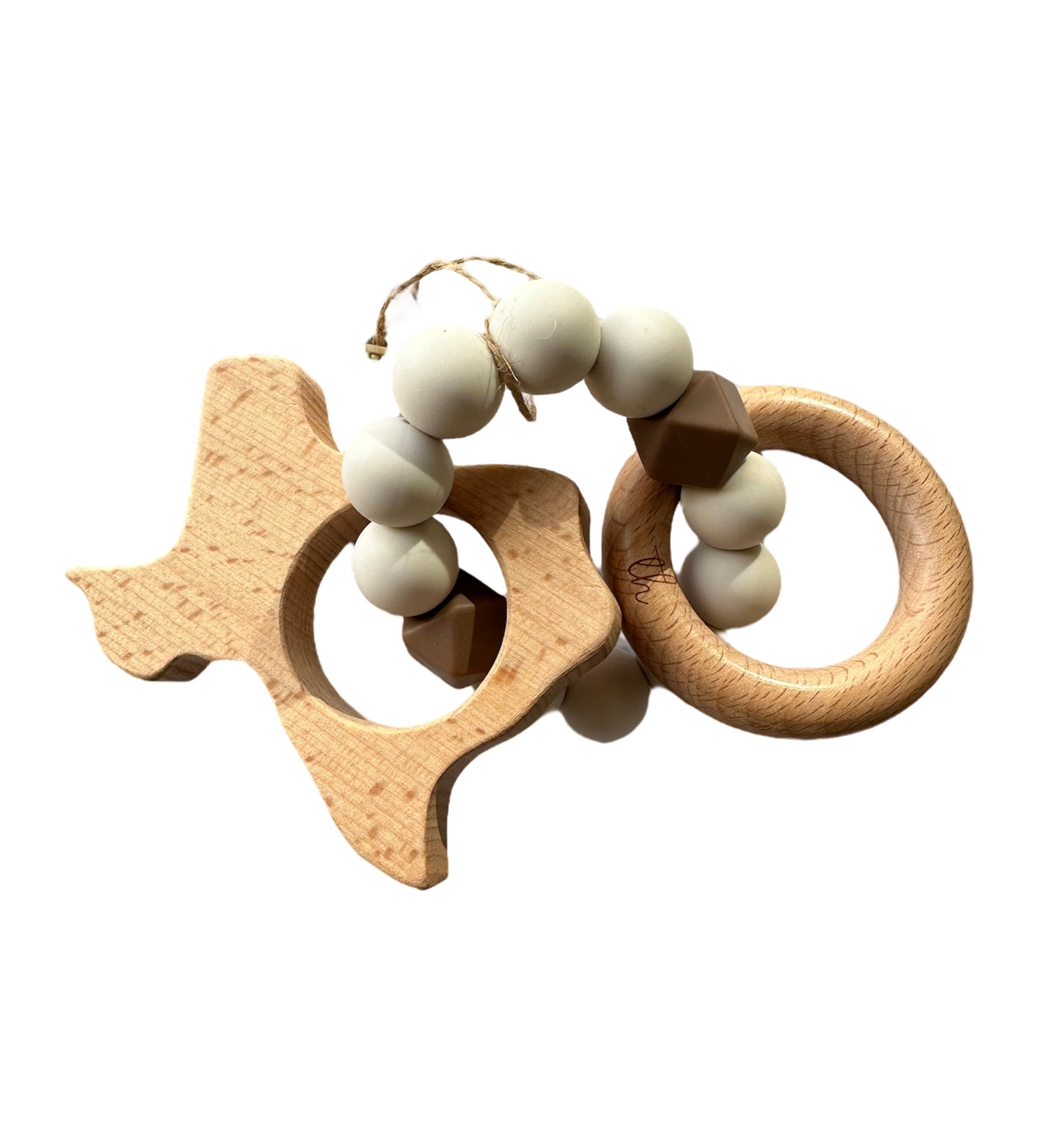 We are most known for our Texas teething rattle handmade with all natural beech wood and bpa free silicone.