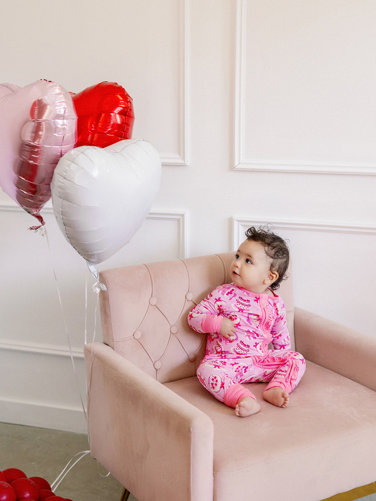 Sweetness overload! This adorable Valentine Cakes Ruffle Romper features charming cake-print details paired with delicate ruffled accents for that extra dash of cuteness. Perfect for little ones who love all things sweet and whimsical, this romper combines comfort with style. The playful design makes it ideal for Valentine's Day celebrations, playdates, or everyday wear. Soft, breathable fabric keeps your baby girl happy and comfortable all day long. A delightful choice for parents who want their little one looking picture-perfect!