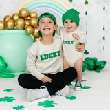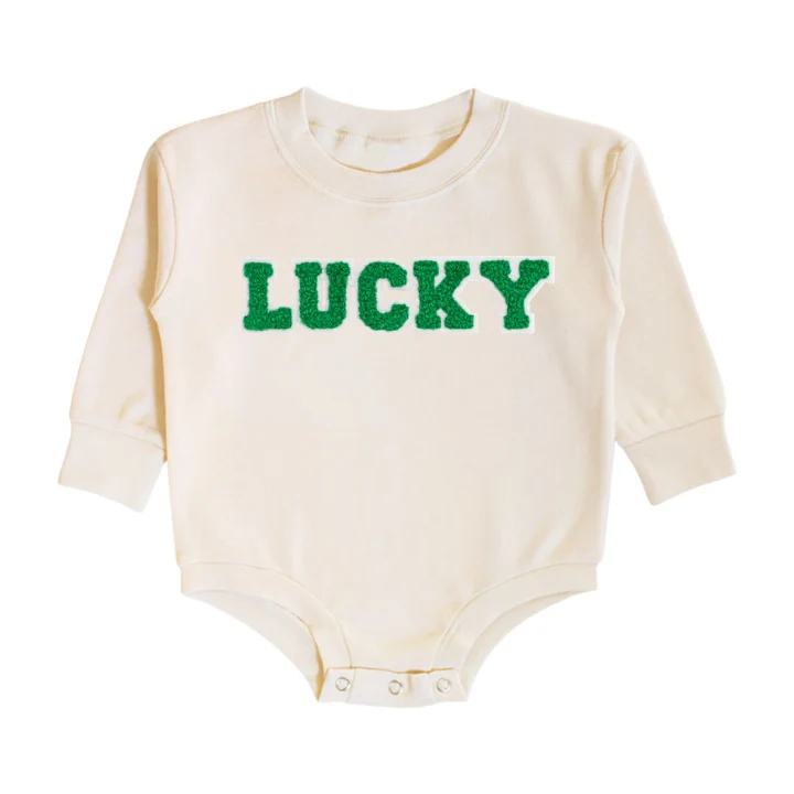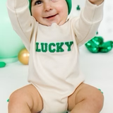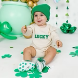 The Lucky Varsity Patch St. Patrick's Day Long Sleeve Romper is a fun and festive romper for babies celebrating St. Patrick's Day!