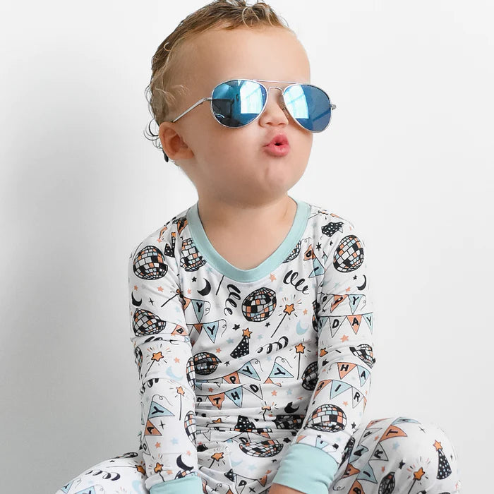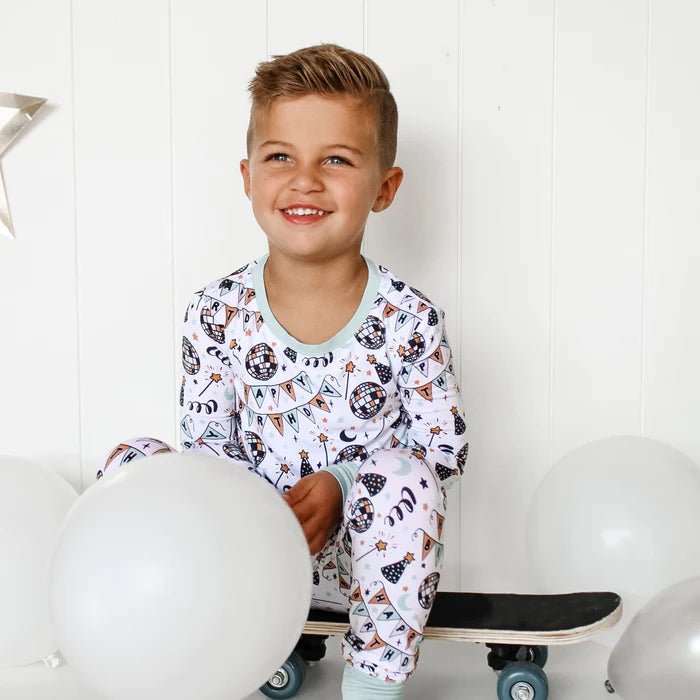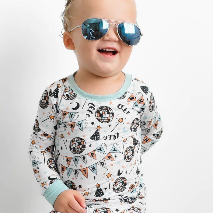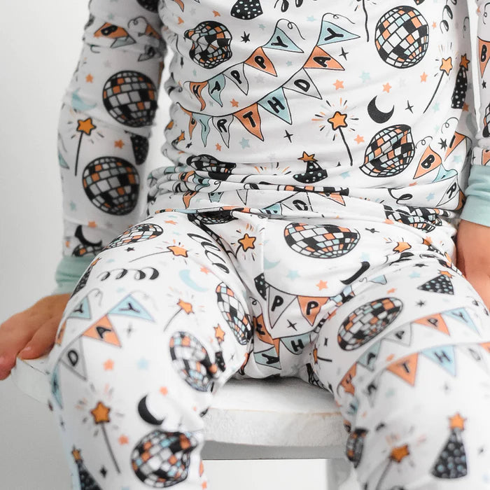 The Disco Birthday Boy Dream set is here to turn any ordinary night into a wild celebration! Decked out with classic long sleeve and pant pajama styling, your little one is ready to boogie the night away - wink wink!!