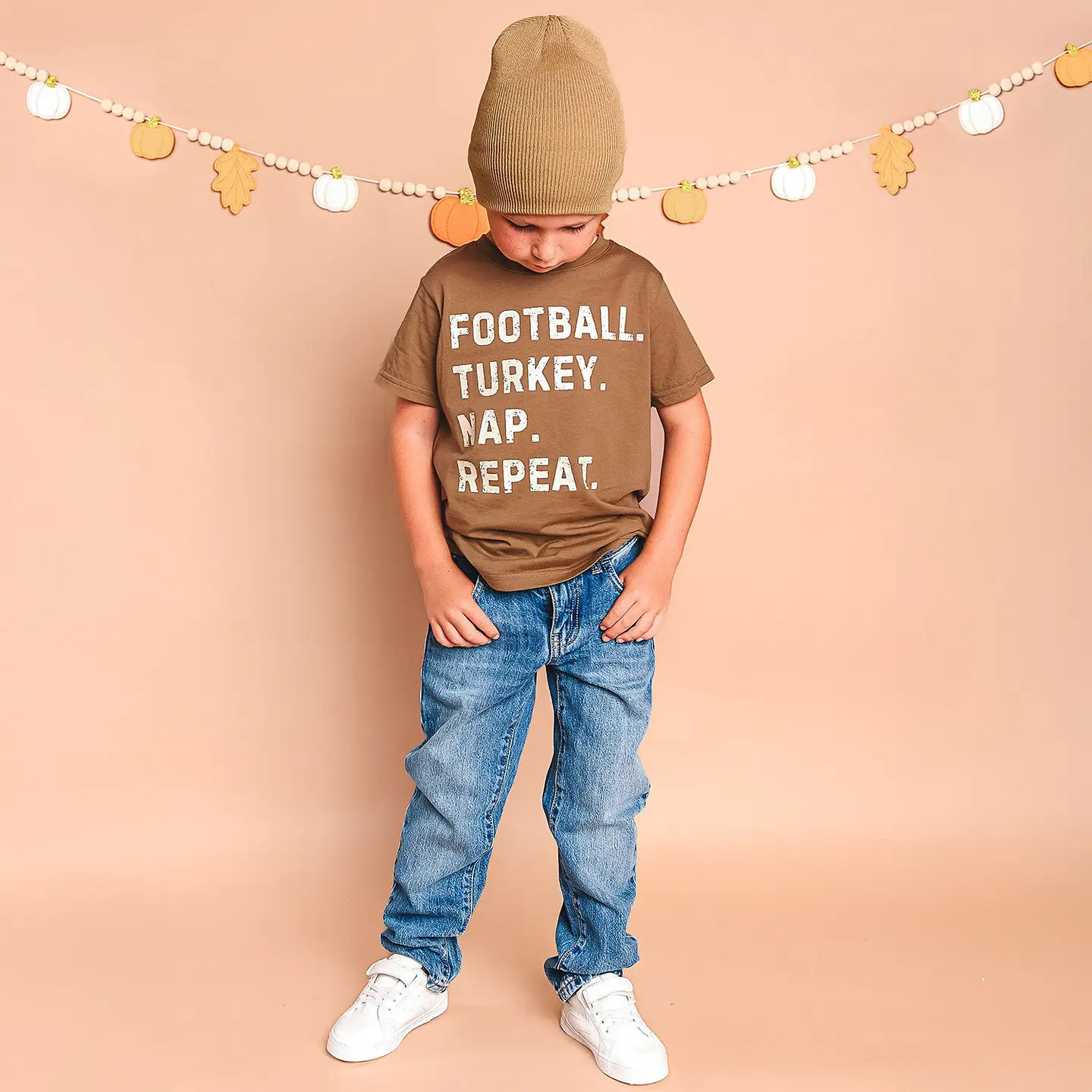 The Football Turkey Nap Repeat Thanksgiving Short Sleeve T-Shirt is a fun and festive t-shirt for kids celebrating Thanksgiving!