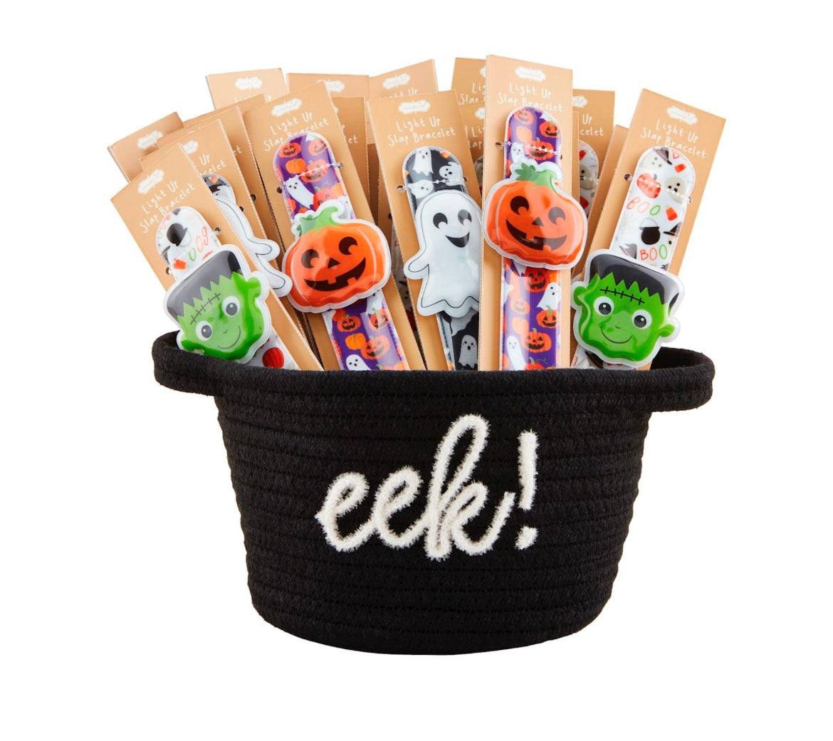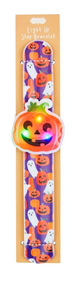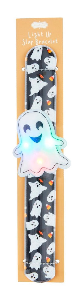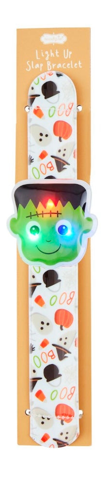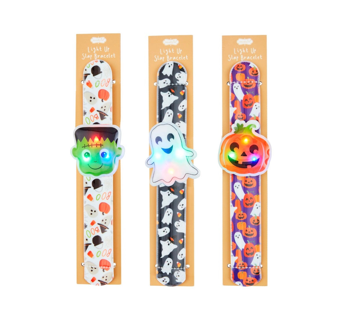Patterned slap bracelet with LED light-up character. Comes on display card in cotton rope display basket. Battery included. Ages 3+
