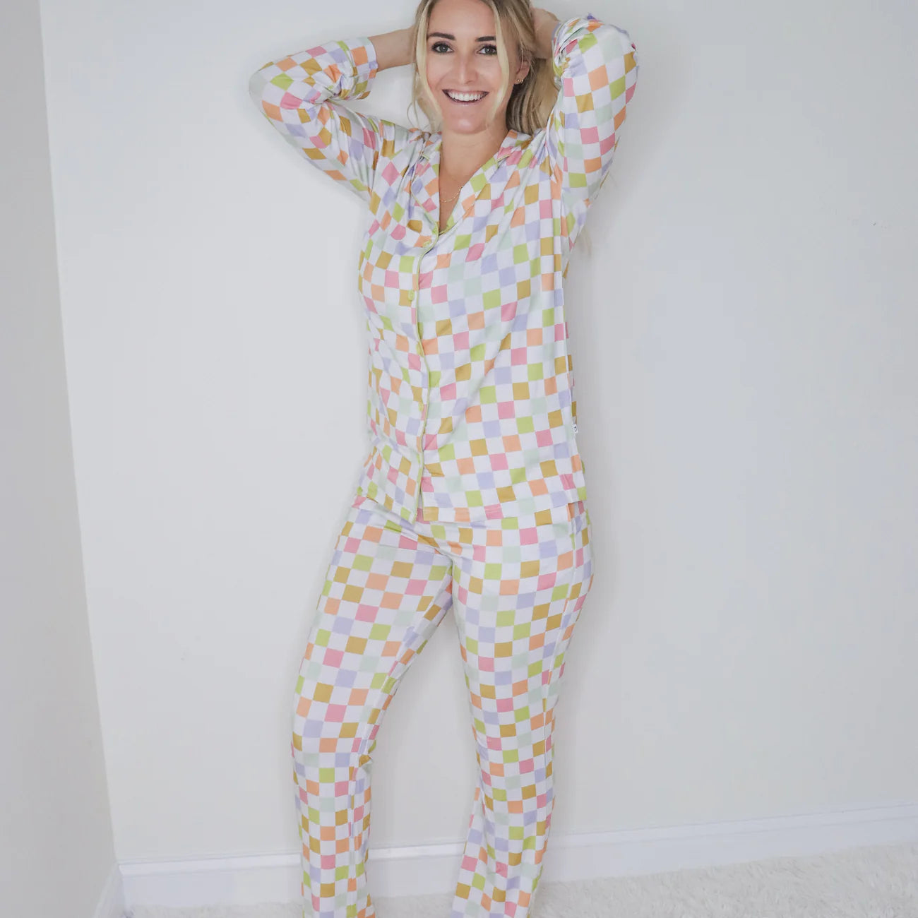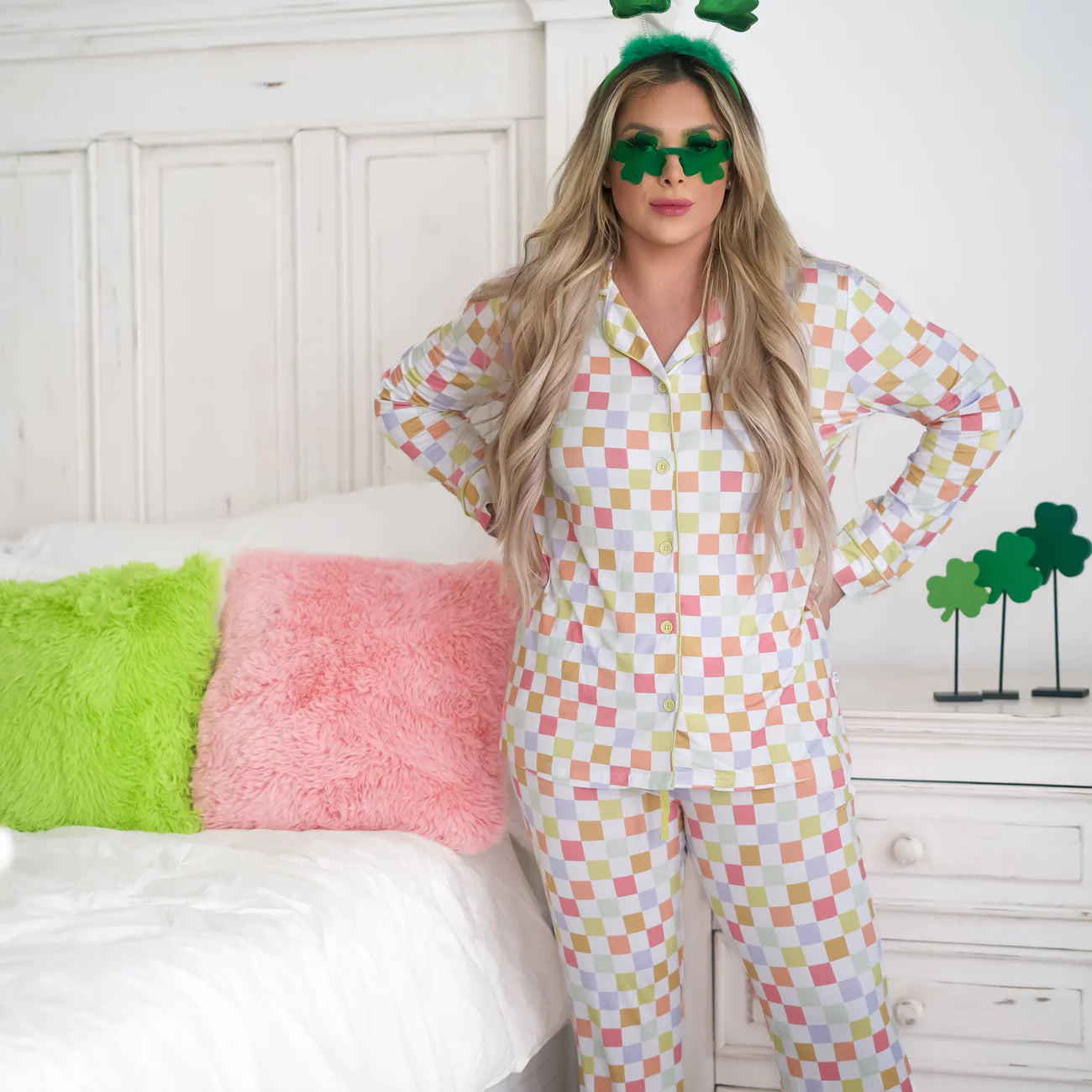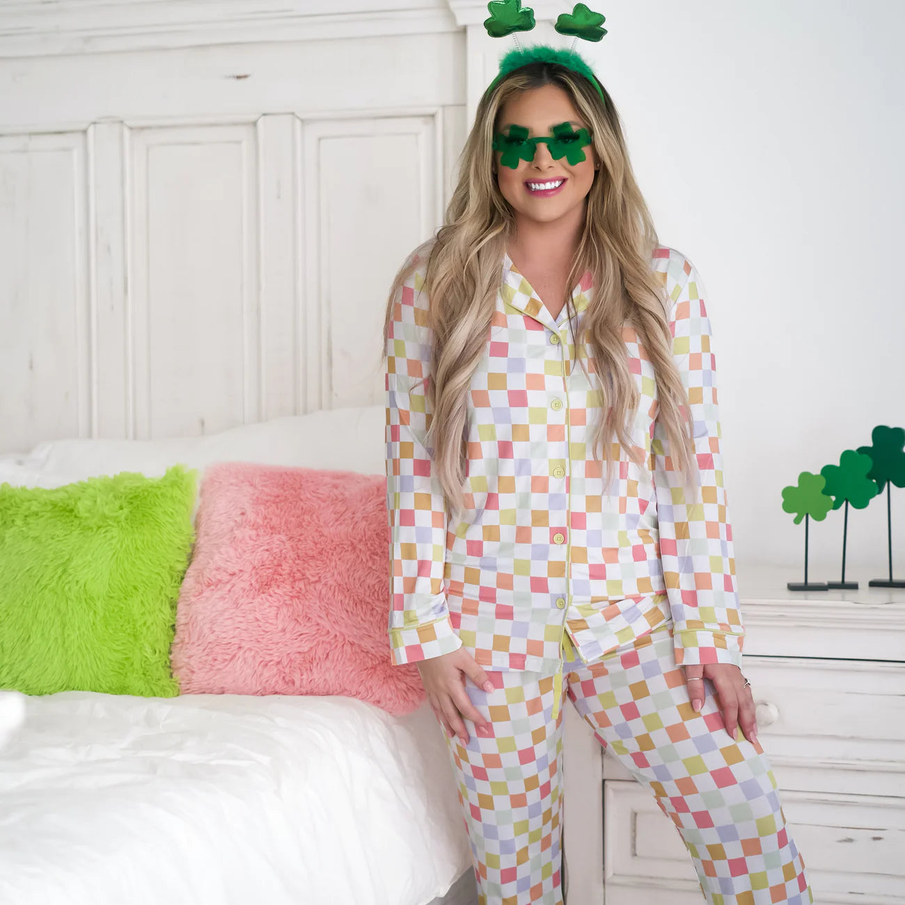 Get ready to lounge in style with our Lucky Charm Checks Women's Relaxed Flare Dream Set. Made from comfortable bamboo material, these womens pjs feature a playful checkered print that will definitely bring some fun to your St. Patrick's Day celebrations. Plus, you can even match with your little ones for a truly lucky look!