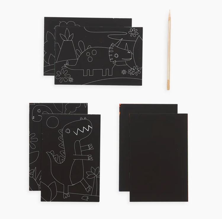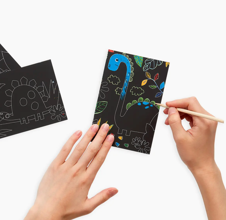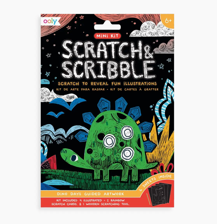 The Dino Days Scratch and Scribble mini scratch art kit has everything you need for travel-sized creativity. Scratch to reveal dinosaur fun.