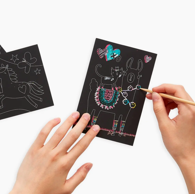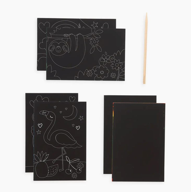 Mini Scratch Art Kit includes 4 different illustrated scratch cards (4 x 6 inches), 2 rainbow scratch cards (4 x 6 inches) and 1 wooden scratching tool Guided illustrations are easy for kids to follow. Add your own patterns and designs to create a unique work of art. Everything that you need is included, along with instructions to get you started Suitable for ages 6 and up