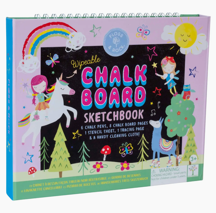Chalk board fun in a wipeable sketchbook format! This brilliant Rainbow Fairy Chalk Board Sketchbook contains 8 pages. 5 pages with ready to colour-in illustrations featuring rainbows, fairies, unicorns and more, plus 3 plain pages ready for freestyle doodling! There's also a tracing sheet and a super, Rainbow Fairy themed stencil sheet. Both these sheets can be removed and clipped into the spiral book bind whereever you choose! The sketchbook comes with 6 coloured chalk pens and a handy cleaning cloth to wipe the pages clean when you're finished, ready to start again and continue with your creativity next time! The pages are printed with vegetable inks and all of the paper, card, plastic and metal contents are recyclable.