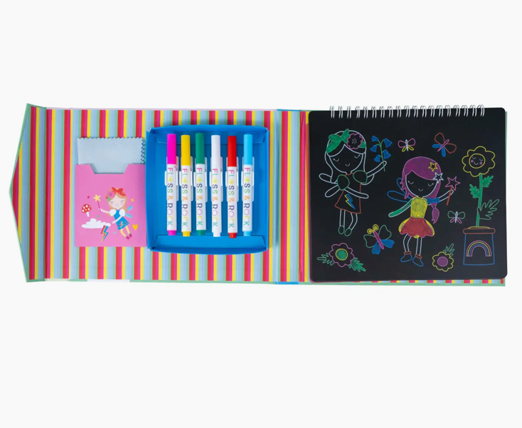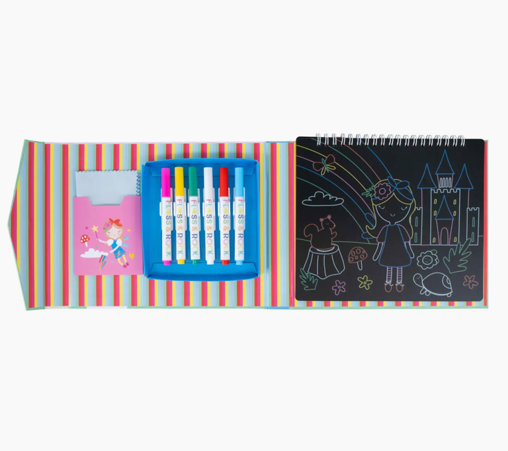 FEATURES: Suitable for ages 3+ 8 pages, plus a removable tracing and stencil sheet 6 chalk pens + a handy cleaning cloth Wipeable pages - can be used over and over! Magnetic clasp to keep all the contents inside Eco friendly DIMENSIONS: 21 x 21.4 x 2.3cm