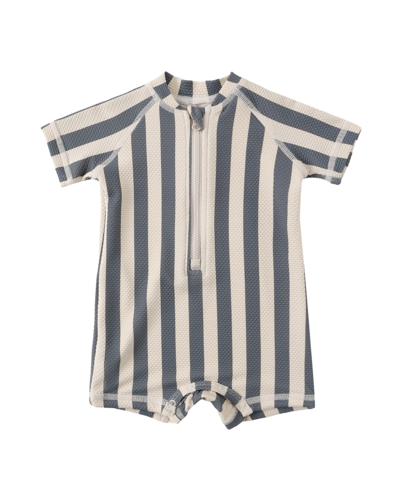 Dive into summer style with this retro-inspired zip rashguard one-piece! Featuring classic ocean stripes in cool blues and whites, it's the perfect blend of vintage charm and modern sun protection. The convenient front zip makes getting in and out a breeze, while the durable rashguard fabric shields little swimmers from UV rays. Whether splashing at the beach or lounging by the pool, this playful piece keeps your baby boy comfortable and looking adorably cool all season long.